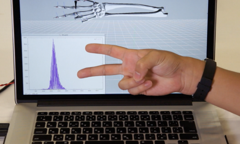 直感的に操作可能なコンピュータの入力装置やインタラクティブなシステムの実現には,高度なセンシング技術が必要不可欠です.そこで,竹村研究室では,人を 計測対象としたセンシング技術・センシングシステムについて,研究を取り組んでいます.主な研究テーマは,視線計測技術と身体を伝播する振動のセンシング であり,これらの情報を手掛かりに人の状態推定や理解に取り組んでいます.右の写真は,能動的に振動を身体に入力し,手形状によって変化する伝播特性を学 習することで,手形状の推定を実現した様子です.このような新しい計測技術の実現に向けて,学生と共に挑戦しています