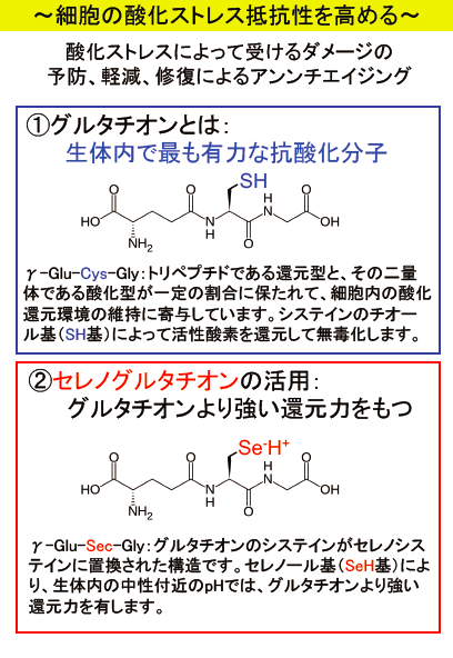 セレンは、過酸化水素を加水分解して無毒化する酵素の活性部位に存在して、酵素の働きに重要な役割を果たしています。そこで私達は、セレンをグルタチオ ンに組み込んだセレノグルタチオンという化合物を調製し、細胞に添加してみたところ、過酸化水素による細胞の致死率を低下させ、生存率を上昇させることが できました。