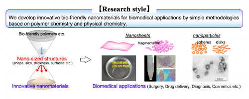 本研究室では、高分子化学・物理化学に立脚した独創的且つ簡便な手法でナノ材料を創製し、人類の健康や医療、環境に役立つ研究に繋げることを目標に掲げて います。特に、生体や環境に優しいナノ材料(ナノシート、ナノ粒子、ナノファイバー)に注目します。分子の特性を理解しながら、目的に応じたナノ材料の設 計、加工、さらには医工連携・異分野融合体制による機能評価までを一貫して行う研究テーマを展開します。既知の分子からこれまでにないユニークな特性をも つナノ材料を創り出す楽しみを共に味わいましょう。