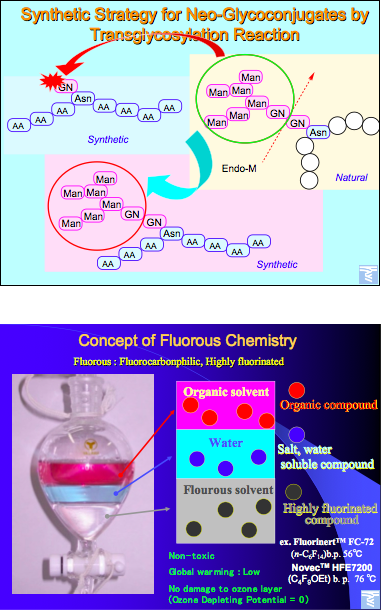 そこで、より簡単に、誰でも合成できるような技術開発が求められています。私たちは医薬への応用を期待して、生体内の生理活性物質(糖ペプチドや糖タンパ ク質など)の合成を行っています。固相合成や酵素合成、フルオラス合成などを駆使した新規な合成法を開発しています。また、開発した合成手法を応用し、最 近では、核廃棄物からウランの抽出にも成功しています。