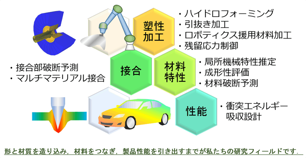 すべての形ある工業製品は材料を加工することで生み出されています.当研究室では精密機械,航空機,自動車,鉄道などへの適用を目指した新しい塑性加工技術 を研究しています.さらに,材料特性の評価手法,材料の変形を予測する数値解析技術,接合技術,製造された製品の性能までを総合的に考えたモノづくり研究 を推進しています.