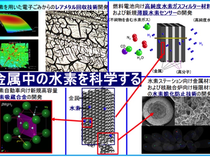 本研究室では、主に水素社会に向けて必要となる種々の材料に関する研究を行っています。ニッケル水素電池や一部のハイブリッドカーにも用いられている水素吸 蔵合金を薄膜とし、種々の合金と複合化する事で新たな水素センサ材料や、水素を高純度化するための水素透過膜を作製しています。また、再生可能エネルギー を利用した電力を用いて水を電気分解する事により、環境負荷が小さい水素という形でエネルギーを貯蔵する方法が考えられていますが、金属がある環境で水素 を利用する際には注意しなければならない現象があります。「水素脆化」と呼ばれ、金属を脆くする現象として知られており、実用に際してはこれを防ぐ必要が あるため、脆化のメカニズムの解明を行うと共に、脆化の進行をモニタリングする事や未然に防ぐための処理に関する研究を行っています。金属中の水素は原子 状で結晶格子間を拡散しますが、金属材料内に存在する転位(結晶のずれ)や欠陥と相互に影響を及ぼすことが知られています。金属内の応力(ストレス、歪 み)の環境によっても偏りが生じることが知られており、水素が金属の機械的な性質とどのように影響し合うか研究を進めています。その他、水素の地産地消に 向けた基礎的な研究や水素をCO2など他の物質と反応させ、別の化学物質とすることでエネルギーを効率的に利用できるプロセスに関連する材料や、プラズマ 環境下の核融合発電施設向け材料の研究、移動体の軽量化に資する炭素繊維強化プラスチック材料と金属の複合化、強靭化および高機能化に関する研究など、次 世代の社会に貢献できる材料の研究を行っています。