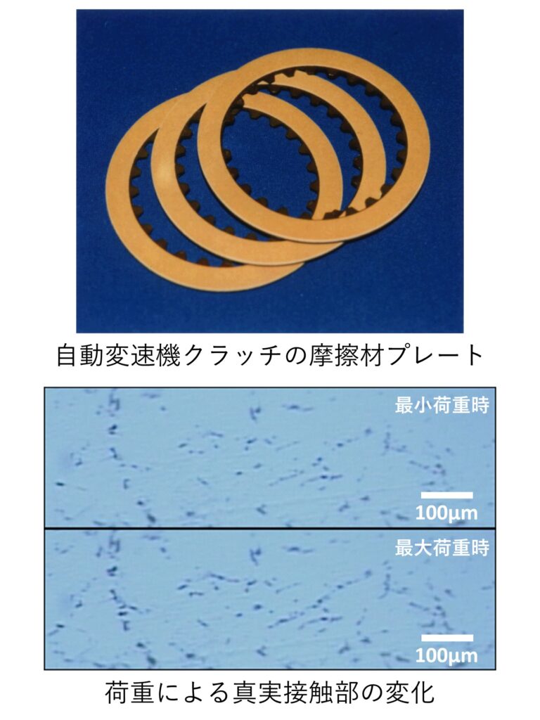 自動車用自動変速機(AT)のクラッチ材には,ペーパ摩擦材が専用油(ATF)に浸された状態で使われており,これが荷重を受けて摩擦を発生しています.こ の材料は柔らかい網目構造の内部に液体を含んでいるため,荷重が変動すると大きく変形すると同時に液体の流動が生じ,接触面内でも液体の出入りが起こりま す.本研究室では,動的条件における変形特性・液体の透過特性・接触特性・摩擦特性などを測定し,現象の解明を行っています.