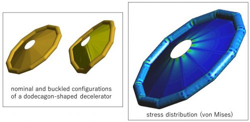 私達の研究室では,有限要素法と呼ばれる数値解析法を利用してGossamer構造物の構造特性を調べています.先に挙げたソーラーセイルの他,大気圏突入の新技術として注目されているバリュートシステム,新型の成層圏気球などが主な研究対象となっています.