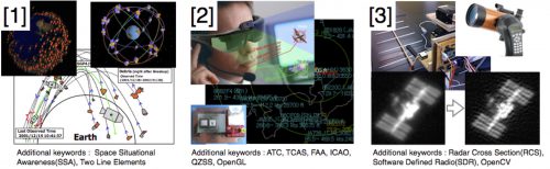 [2]宇宙航空管制システムの開発:衛星や宇宙観光旅行の宇宙船が,デブリと衝突する事故を未然に回避,また宇宙から地上に落下してくるデブリと航空機と の衝突を回避するための,宇宙航空管制のシステムを開発しています.安全な宇宙空間,安全な空を目指すための技術となります.