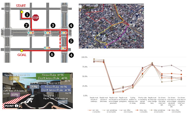 たとえば,自転車は免許が要らない手軽で便利な交通手段ですが,実は事故が多く発生しており,最近では,歩行者にケガを負わせる加害者としての事故も増え てきています.しかし,自転車利用者側はその危険性を認識しておらず,ルール遵守意識も低い状況です.そこで,道路のデザインや事故の危険性を伝える方法 等を工夫して,自転車利用者の安全利用意識が高まるための方策を検討しています.