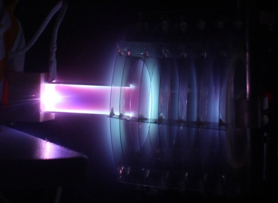 宇宙でものを運ぶためのエンジン(推進機)の研究を行っています.このエンジンの用途は二通りあり,人工衛星や宇宙探査機の姿勢を制御する補助エンジンとこ れらを遠方の軌道に飛ばすためのメインエンジンがあります.宇宙では利用できる推進剤に限りがあるので,エンジンから排出する推進剤をできるだけ少量で可 能か限り高い速度で飛ばす方が推進剤の利用効率(自動車に例えると燃費)が高く有利です.このためには,推進剤をプラズマ化して電気的に加速する方法(プ ラズマ推進機)が優れています.この種の推進機の最も代表的な例は小惑星探査機はやぶさ(日本)やドーン(米国)のイオンエンジンです.私の研究室では, このようなプラズマ推進機の中でもより単純な仕組みでより高いプラズマ速度を達成可能な新しい加速方式(推進機)について研究を行っています.図はその一 例で,二枚の加速電極をコンデンサ(あらかじめ高電圧に充電)に接続し,これらの間に挟んだ固体推進剤にパルスレーザーを照射して,発生したプラズマ中を 流れる大電流とこの電流による磁場の相互作用(ローレンツ力)でプラズマを電磁加速する様子を示した写真です.図中右側は発生したプラズマを受けるター ゲットで,この変位を計測することで,推進機が発したプラズマの力積を測ることができます.単純な構造を目指しているので,ほとんど全ての推進機および周 辺機器は手づくりしています.既存の概念にとらわれない独創的な学生が多数いる大学で最適な研究対象です.