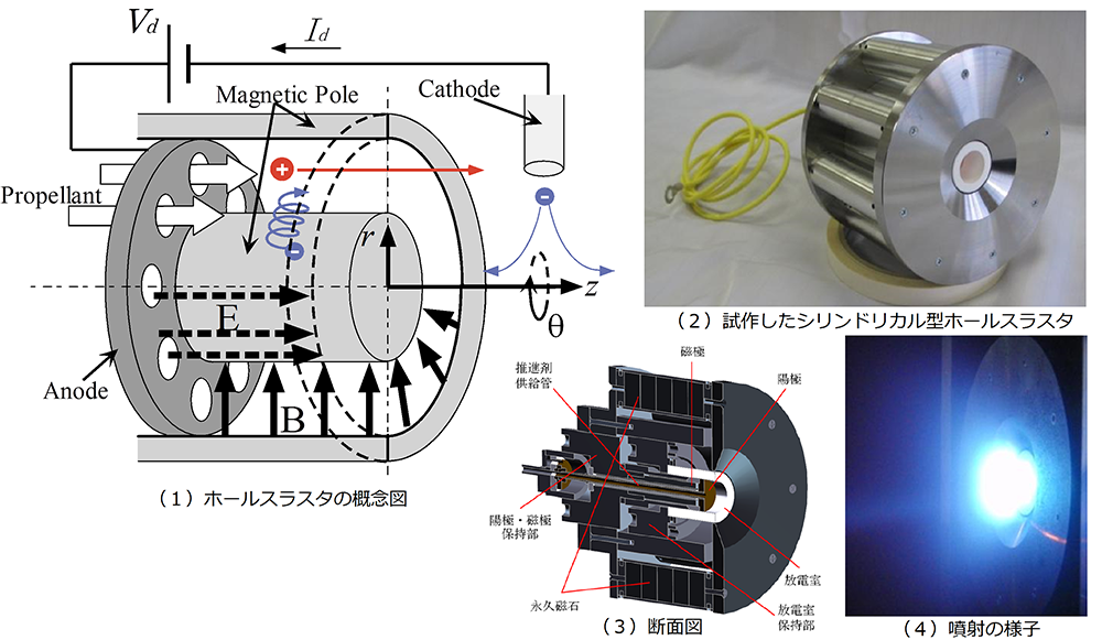エンジン内部の電場と磁場の作用によって推進剤をプラズマ化し、それを電気的に加速・噴射を行って推力を得る「シリンドリカル型ホールスラスタ」を小型・省電力化する研究開発を行っています。