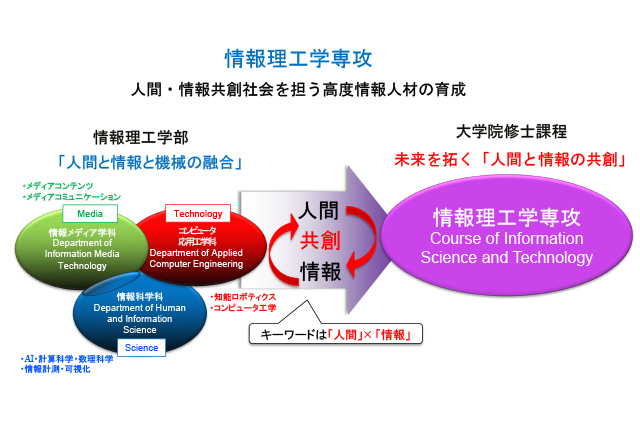 生成型AIの著しい発展に象徴されるように現代は膨大な情報が生成され、それにより人間や社会が大きく影響されています。これからの「人間」と「情報」の関係は、人間が情報を創り使うと共に、情報によって人間の生き方までもが創られてゆくという「共創」が重要です。情報理工学専攻はこのような考えの下に、人間と情報の共創社会を担う、新たな視点を持つ情報人材の育成を目標としています。